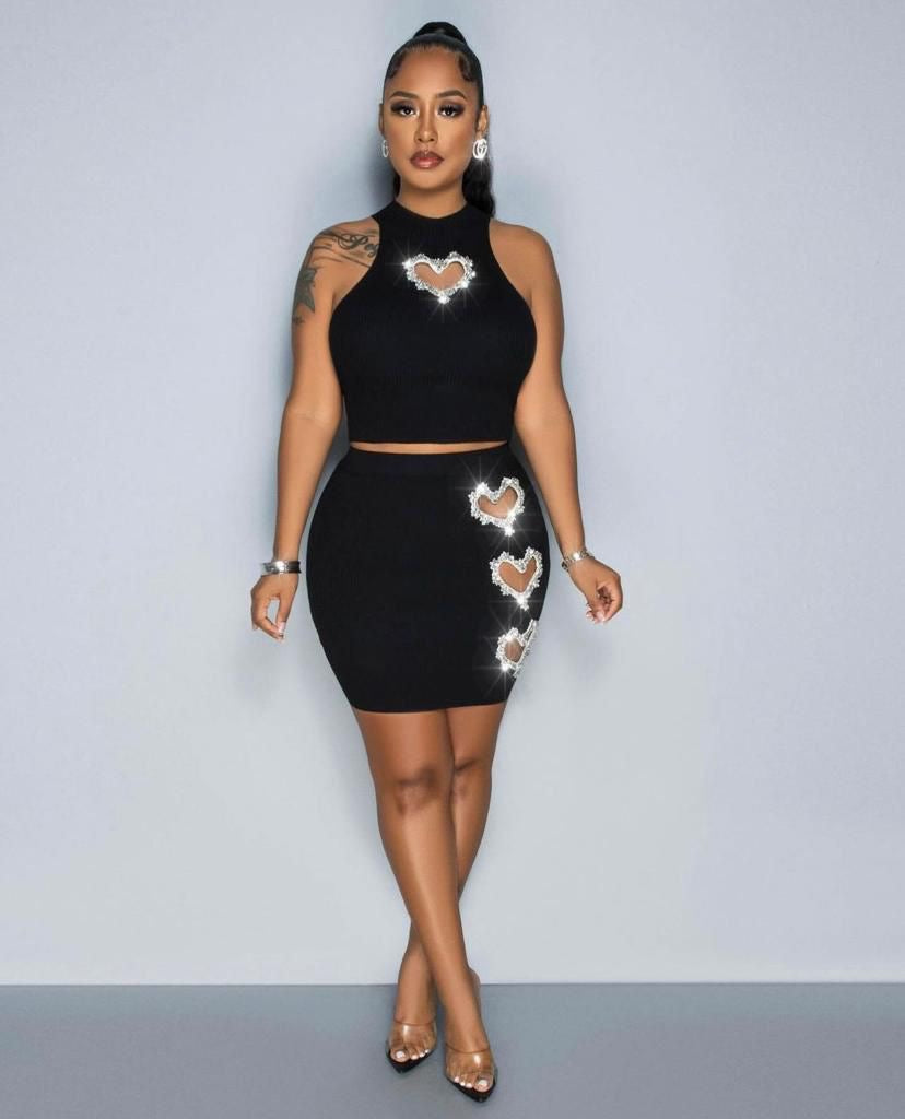 This captivating two-piece set exudes confidence and allure. The intricate heart-shaped crystal cutouts add a playful yet sophisticated touch, making this a standout ensemble for any occasion. The ribbed fabric molds to your curves, creating a flattering silhouette that commands attention.