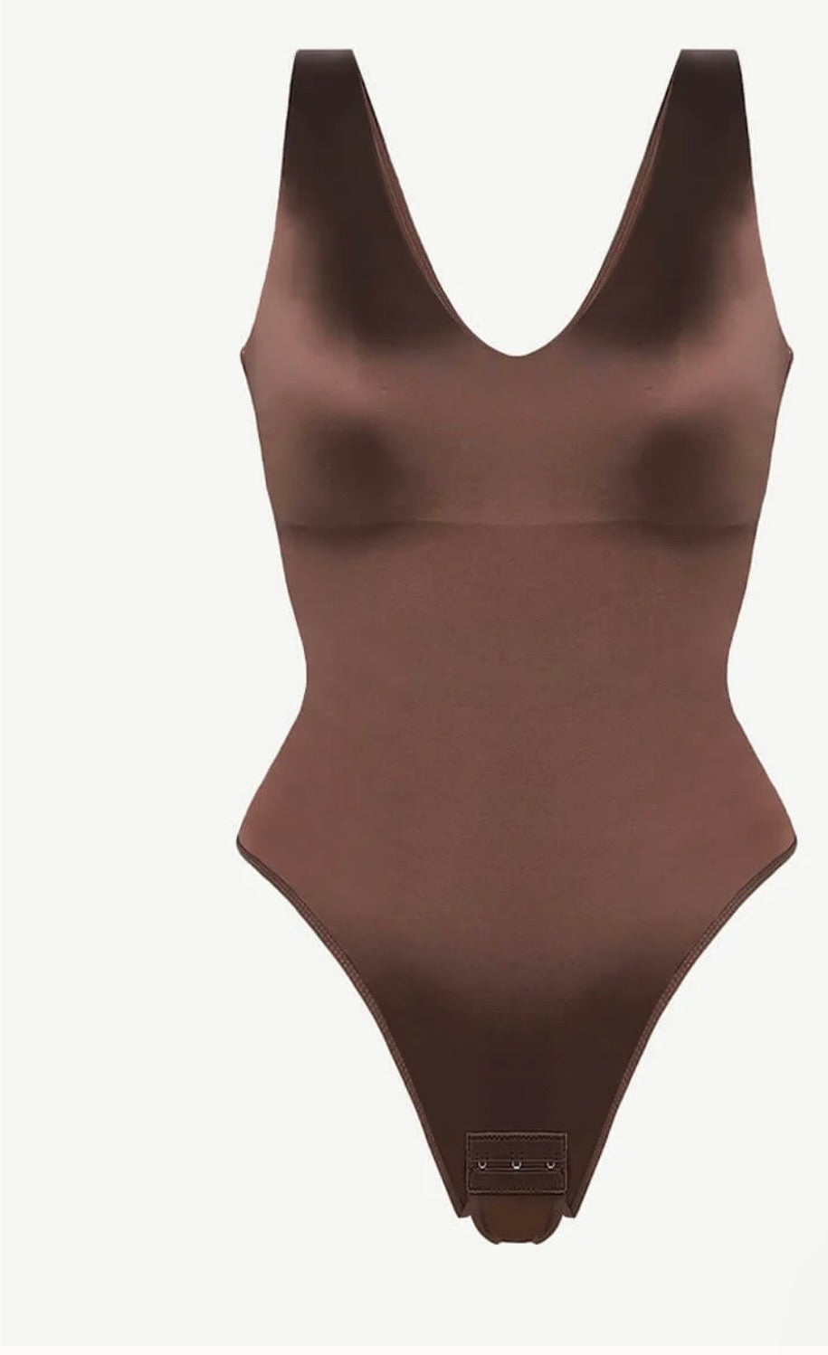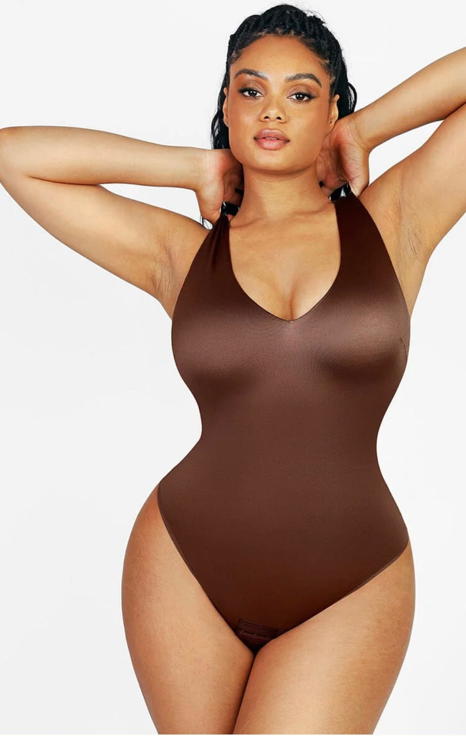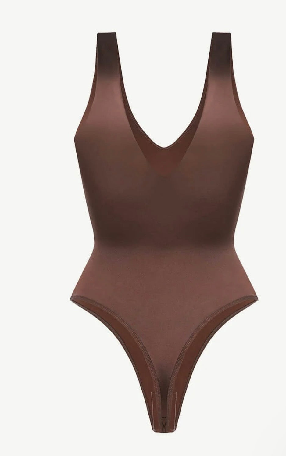 Sculpting Brown Bodysuit with Deep V-Neckline - Flattering and Chic